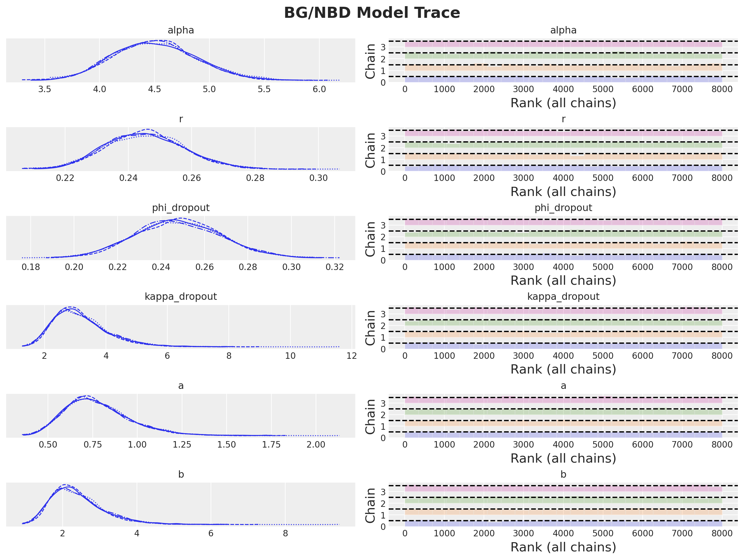 Instead of estimating \(\lambda\) and \(p\) for each specific customer, we do it for a randomly chosen customer, i.e. we work with the expected values of the parameters. Hence, we are interesting in finding the posterior distribution of the parameters \(r\), \(\alpha\), \(a\), and \(b\).