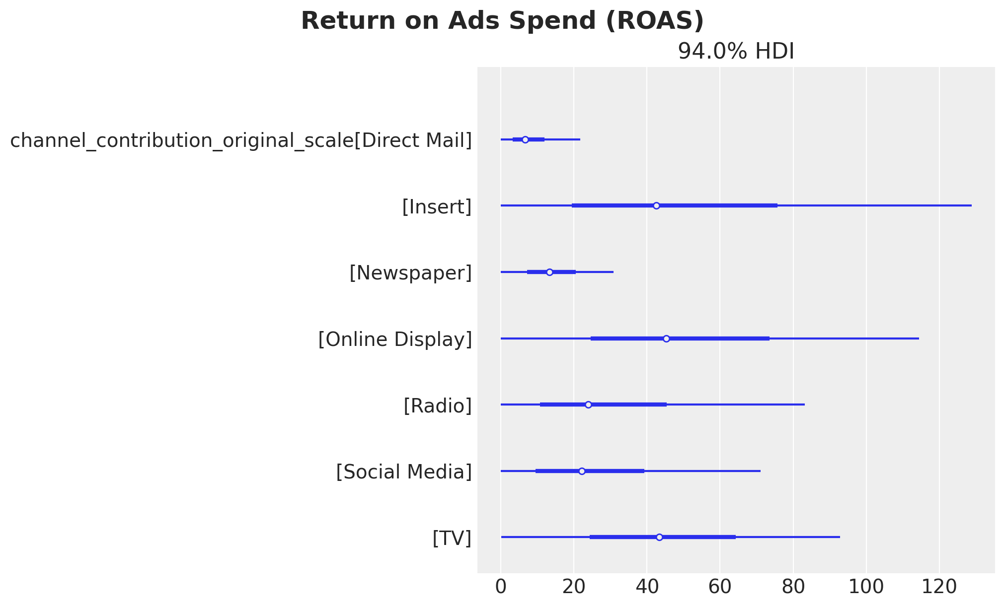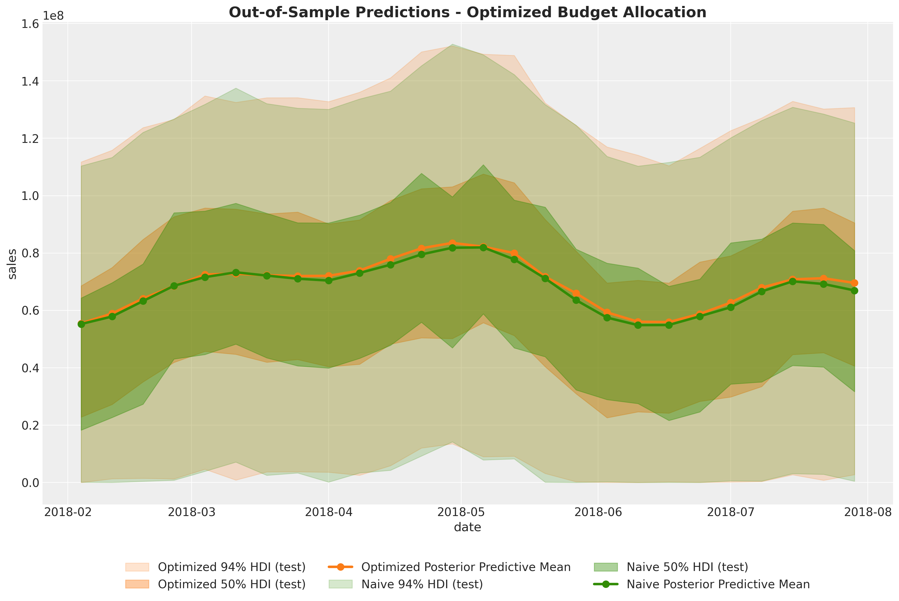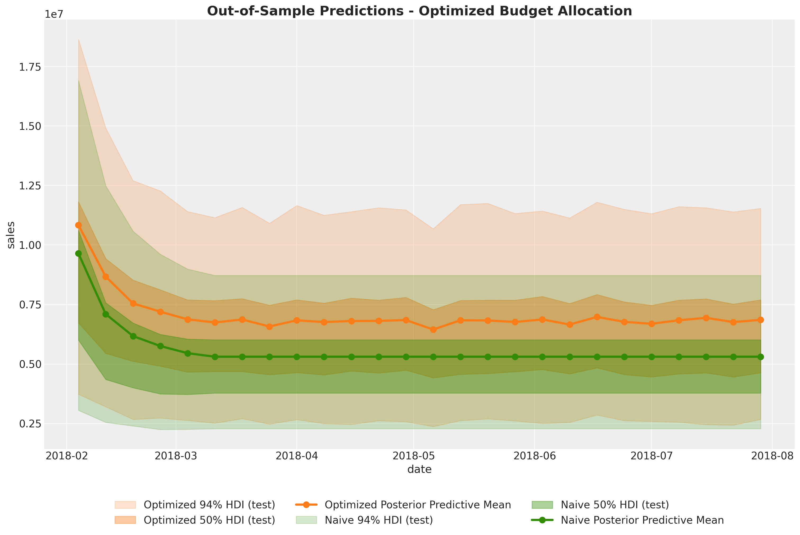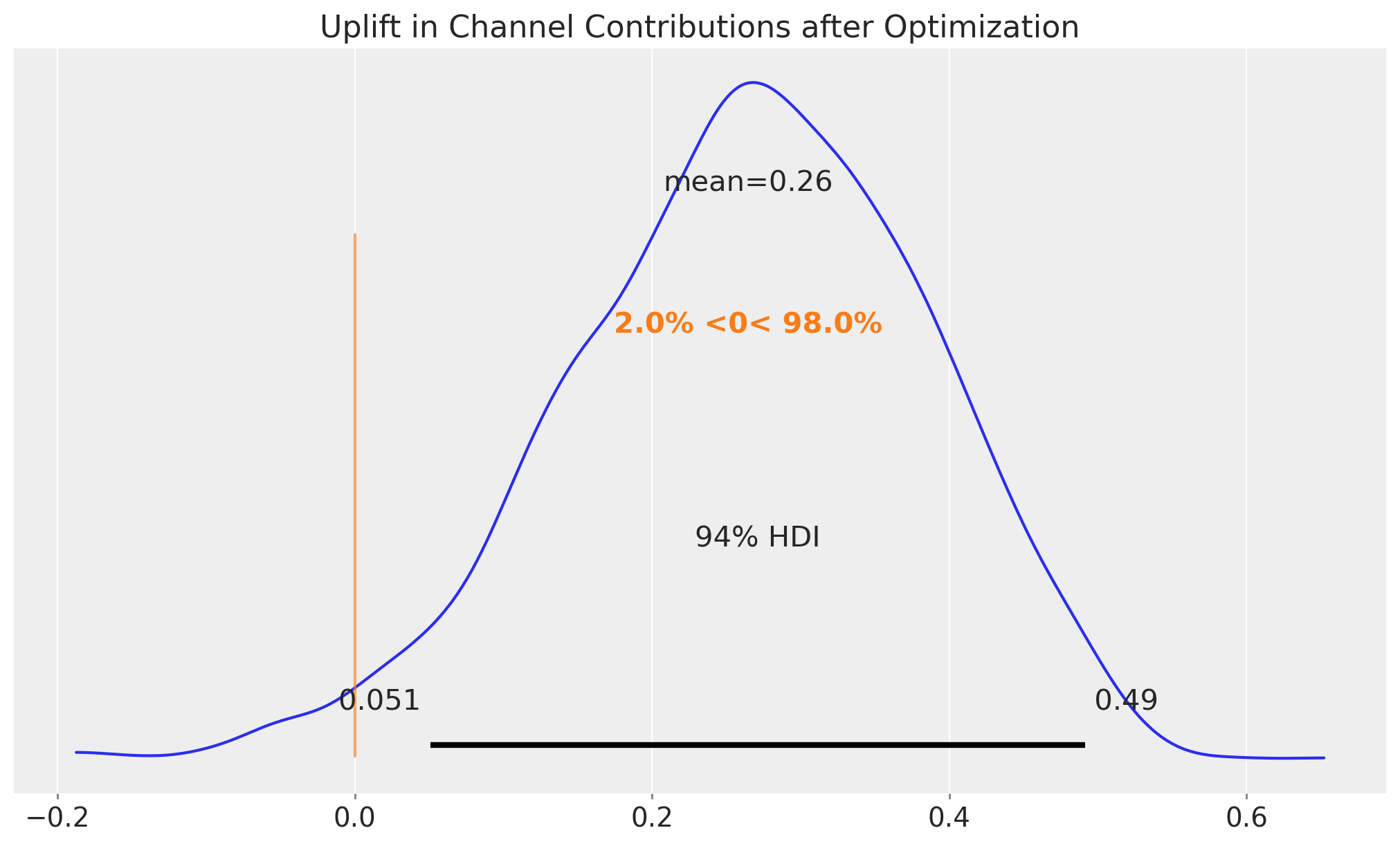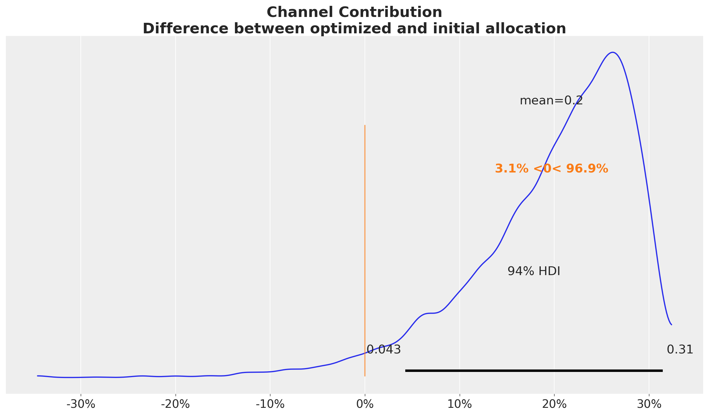In this case we see that when we compare the posterior samples of the uplift to the reference value of zero we do not find any difference. This should not be discouraging as we did see a \(20\%\) increase in the aggregated (over time) channel contributions. This can translate to a lot of money! There is no discrepancy on the results. What we are seeing is that the constrained optimization problem where we are just allowed, because of business requirements (which is very common for many marketing teams), to change the budget up to \(50\%\) we improved the channel contributions significantly but not at the same order of magnitude of the other model components.