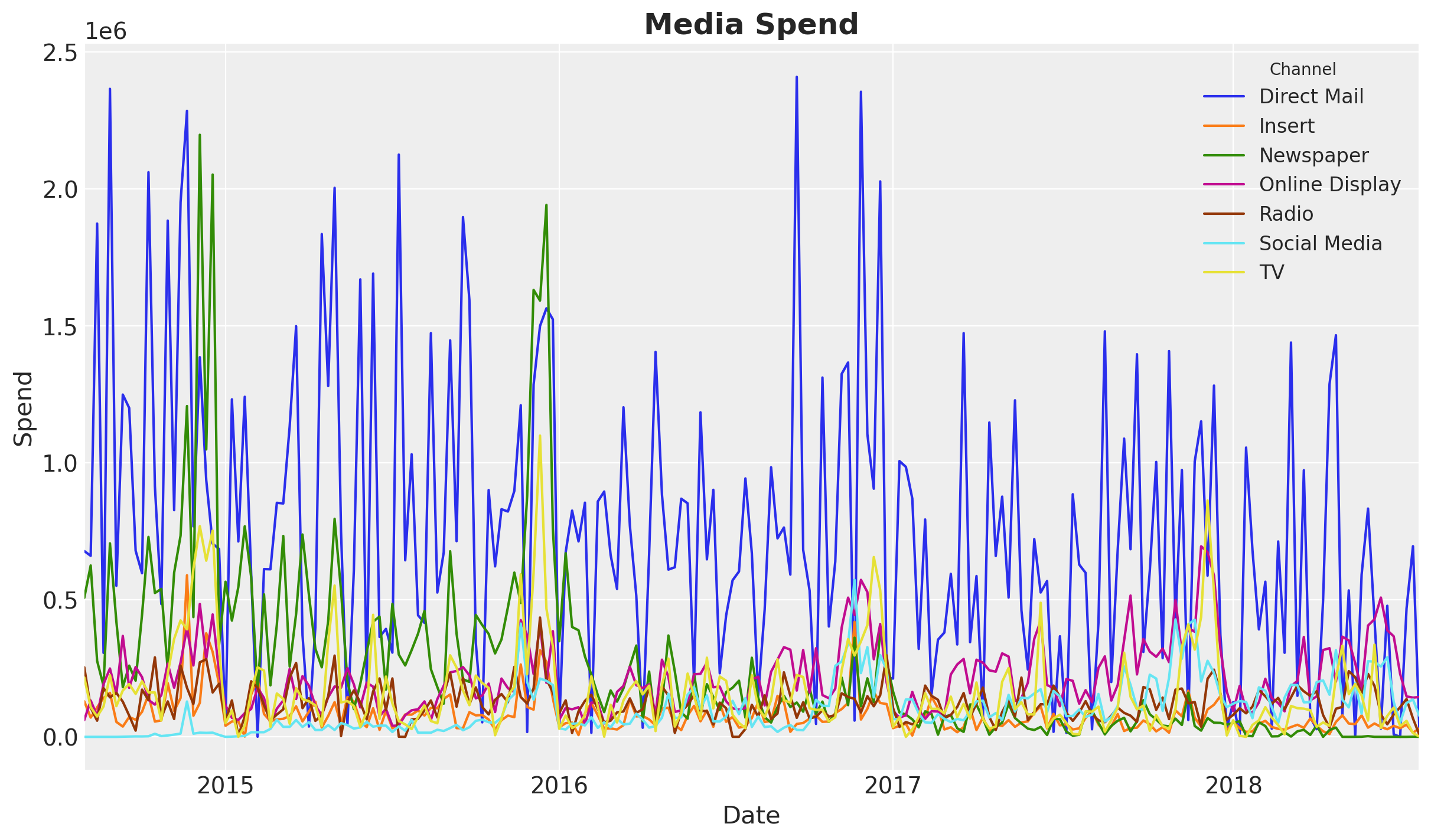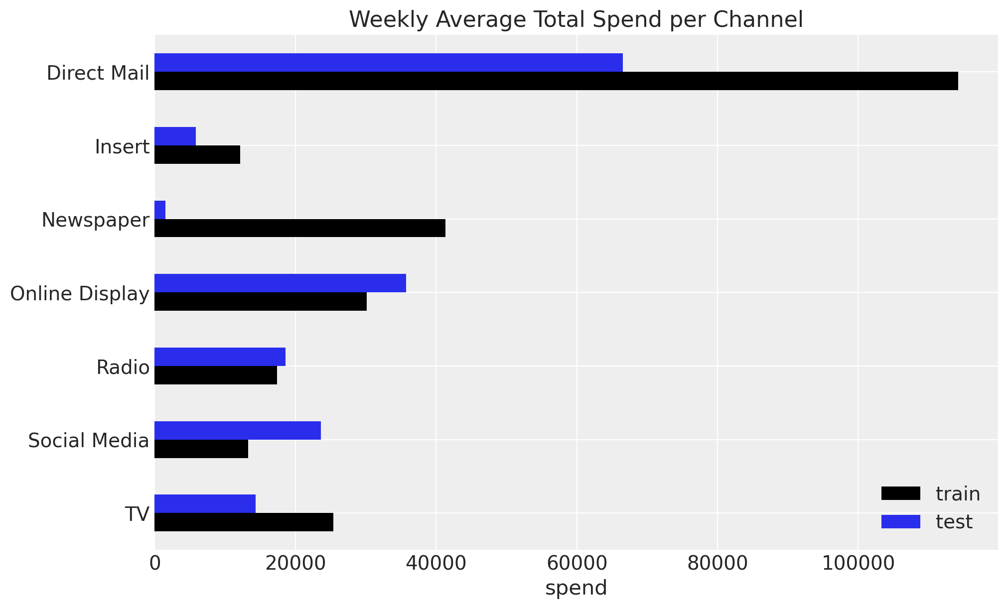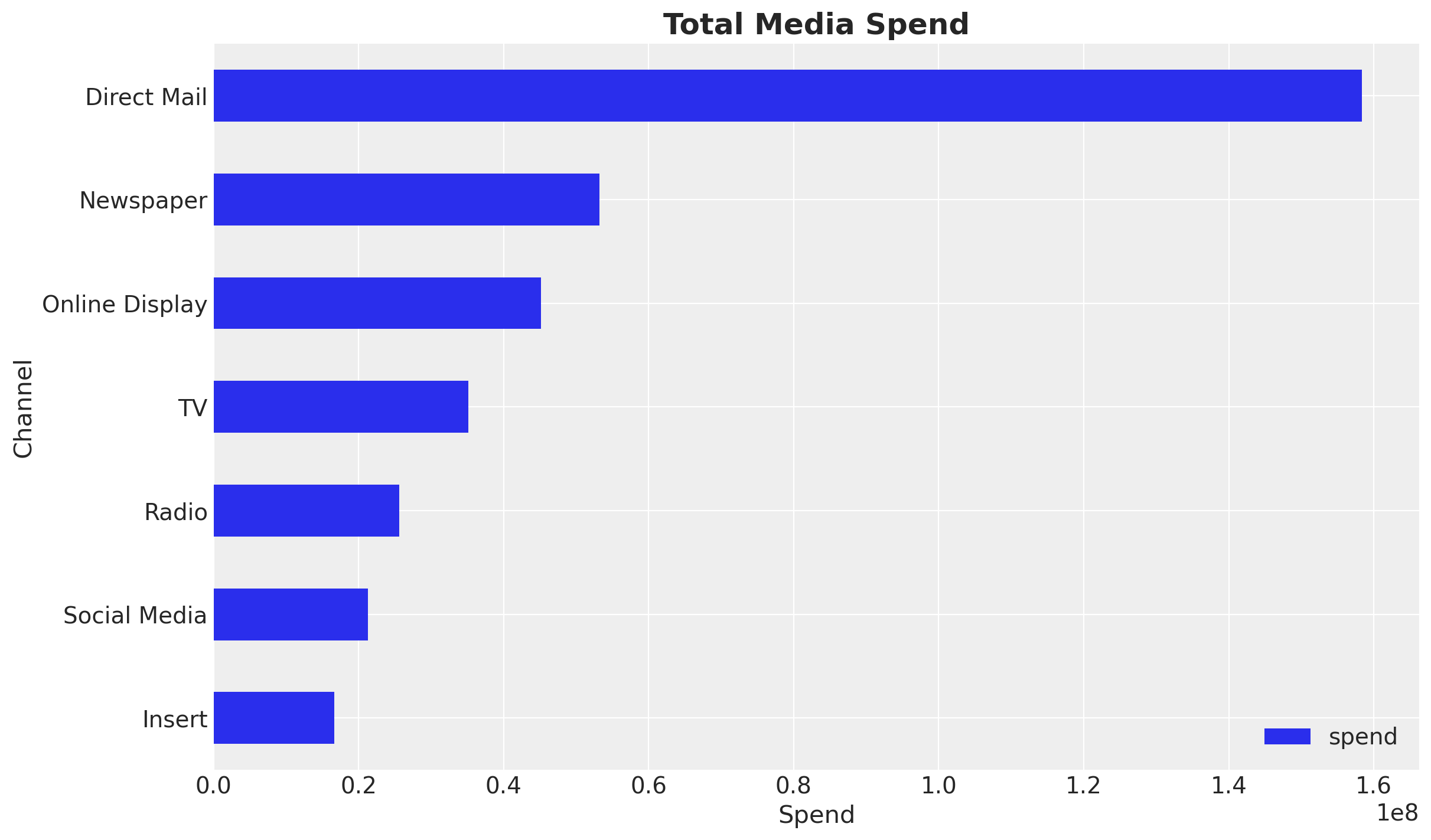 In this specific example we see that Direct Mail is the channel with the highest spend, followed by Newspaper and Online Display.