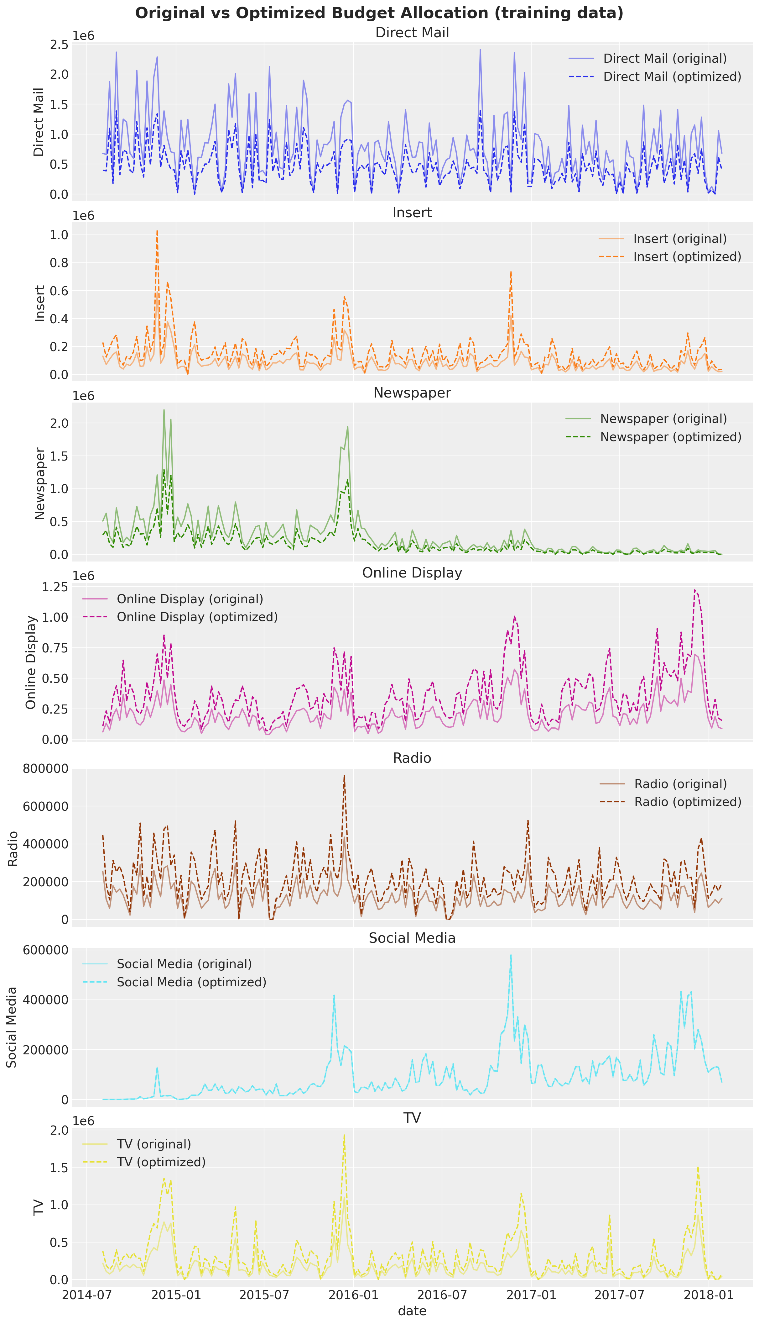 In today’s competitive business landscape, optimizing marketing spend across channels is crucial for maximizing return on investment and driving business growth. This notebook demonstrates how to leverage PyMC-Marketing’s Media Mix Modeling (MMM) to gain actionable insights into marketing effectiveness and optimize budget allocation.