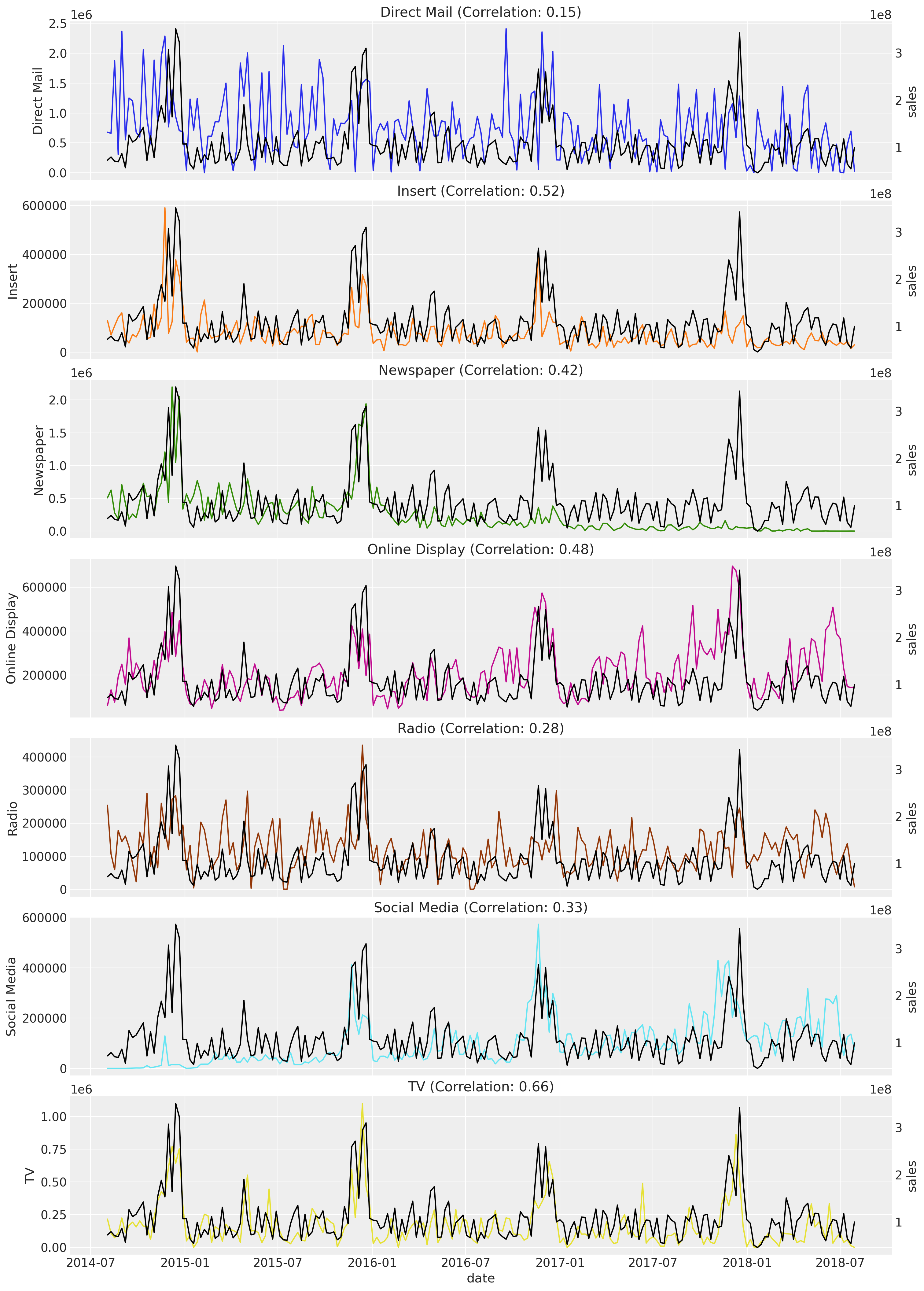 Next, we look into the time series of each of the marketing channels.