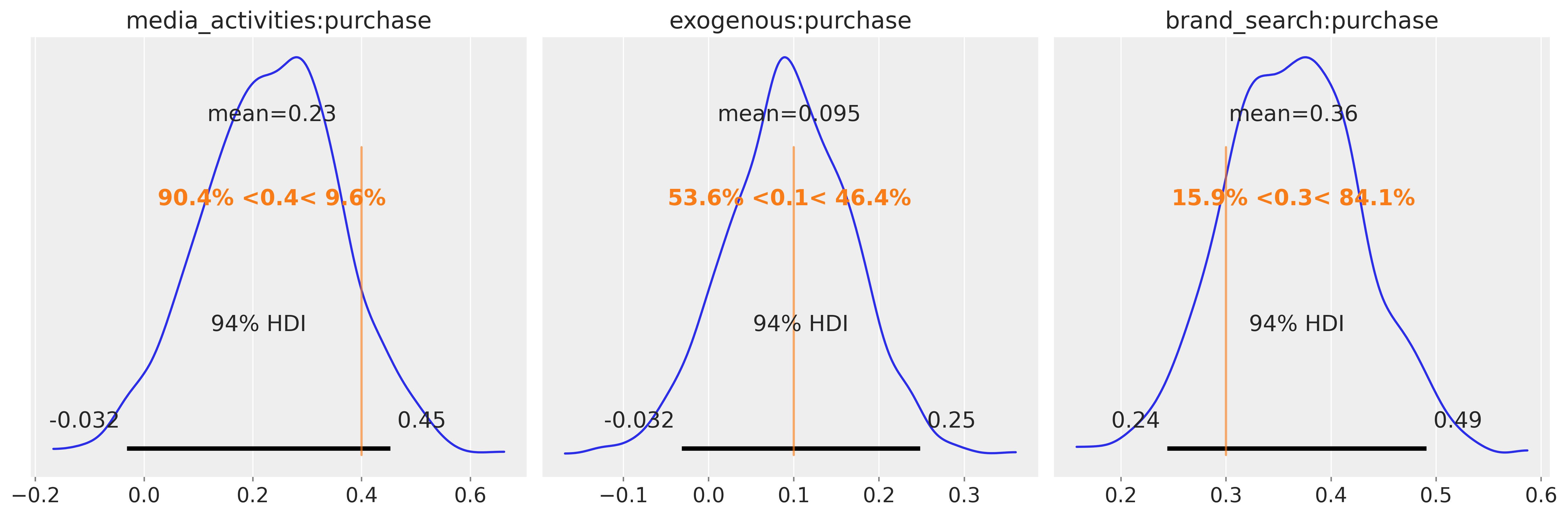 az.plot_posterior(idata, var_names=["brand_search:purchase"], ref_val=0.3, ax=axes[2])