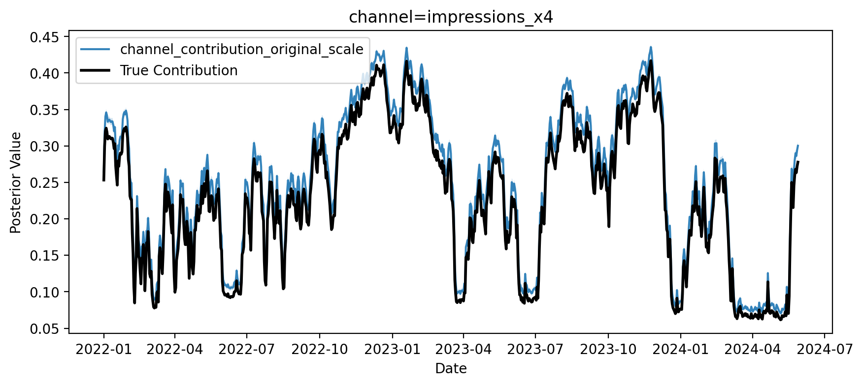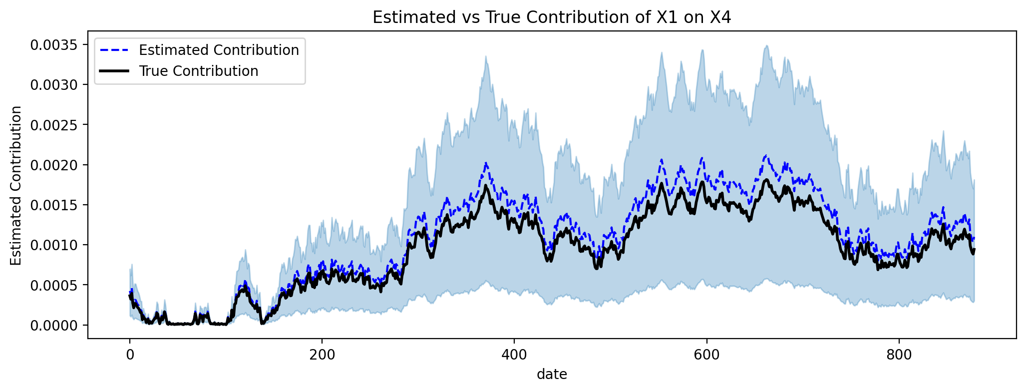 Great, we can see that the estimated contribution is very close to the true contribution in the in-sample period. We can do the same for the out-of-sample period, and using the out of sample period, we can check if we recovered the causal effect of \(X1\) on \(Y\).