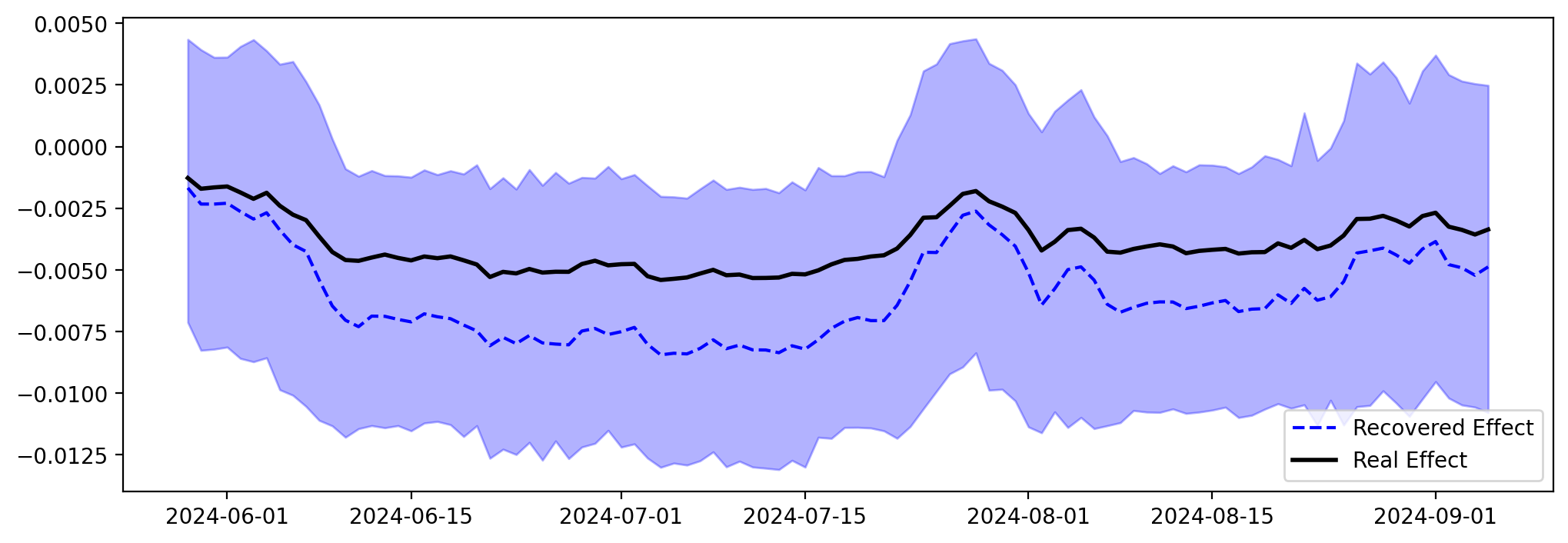 This is great, we can see that the recovered effect is very close to the true effect in the in-sample period. We can do the same for the out-of-sample period, and using the out of sample period, we observe the causal effect of \(X1\) on \(Y\) was properly recovered.